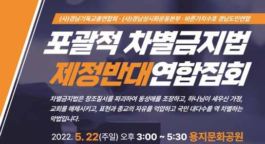 사단법인 경남기독교총연합회(대표회장 이경은 목사)와 사단법인 경남성시화운동본부, 바른가치수호경남도민연합(상임대표 원대연 목사)가 공동으로 주최하는 포괄적 차별금지법 제정반대 연합집회를 오는 5월 22일(주일) 오후 3시, 창원시 성산구 용지문화공원에서 가진다.