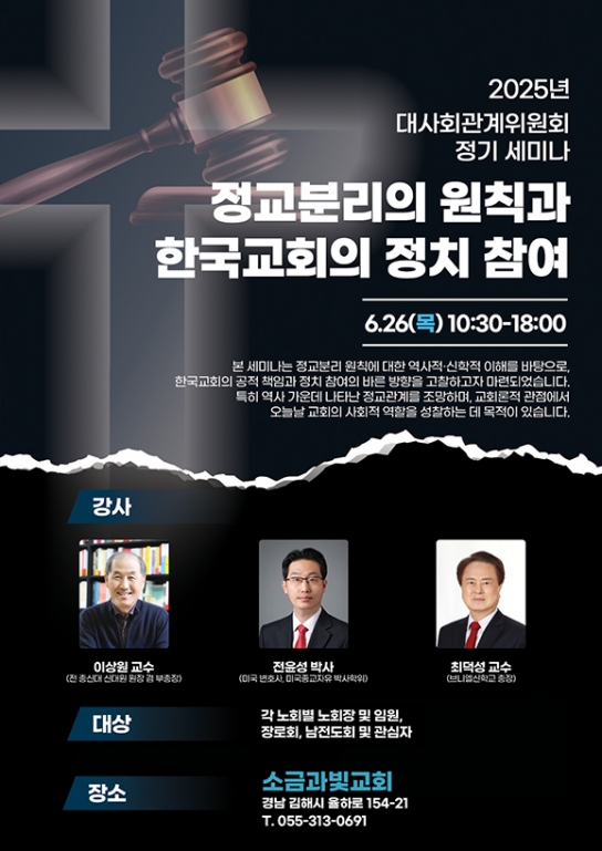 예장(고신) 대사회관계위원회는 오는 6월 26일(목) 오전 10시 30분부터 오후 6시까지 김해 소금과빛교회(경남 김해시 율하로 154-21)에서 ‘정교분리의 원칙과 한국교회의 정치 참여’를 주제로 2025년 정기 세미나를 개최한다.